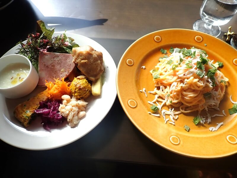 右のパスタは”桜島大根のみぞれソース生しらすの明太パスタ”。。。